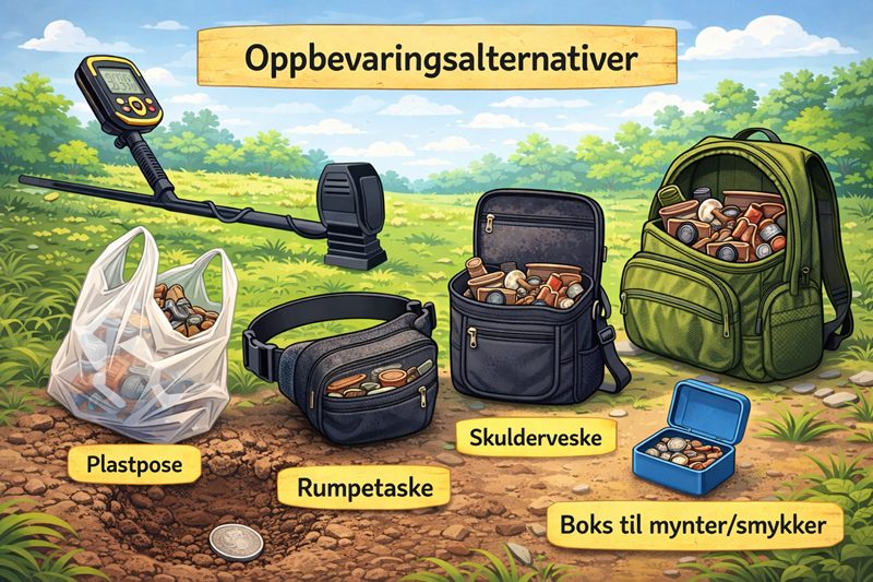 Du trenger et sted å legge funnene dine. Og ja, du kommer til å finne mye skrot også, så ha en egen lomme eller pose til søppel og ta det med hjem i stedet for å grave det opp og la det ligge igjen.